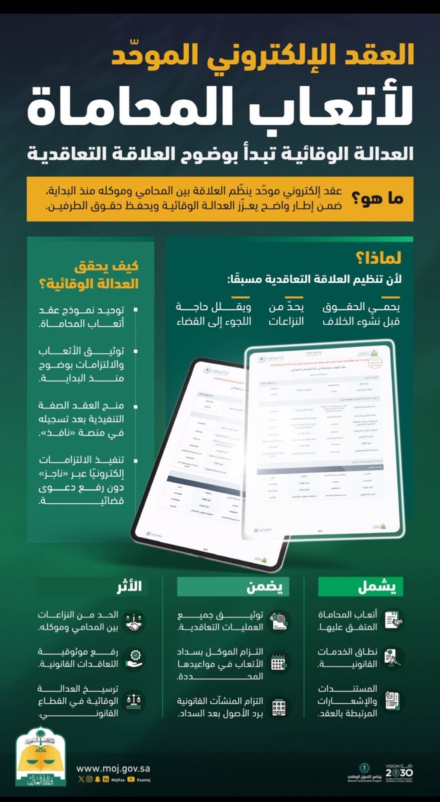 ومن حيث المبدأ، فإن تبني عقد إلكتروني موحد لأتعاب المحاماة يُعد توجهًا نظاميًا سليمًا ومتقدمًا؛ إذ ينسجم مع مستهدفات رؤية المملكة 2030 في رقمنة الخدمات وتعزيز كفاءة العدالة، ويواكب مسار رقمنة العدالة وتطوير الخدمات القانونية، كما يرفع مستوى الثقة في المهنة، ويُسهم في تقليل المنازعات المهنية قبل وقوعها.